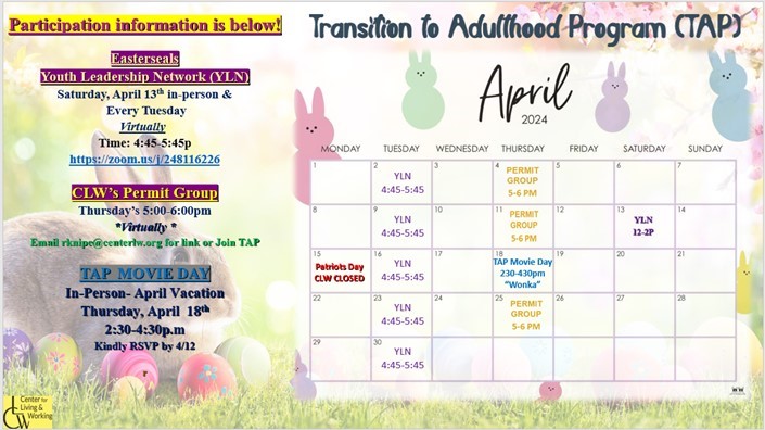 TAP April 2024 calendar offers social and focused group workshops and networking events to build and sustain social opportunities. For parents, Your Access Advocates partners with Easter Seals of Worcester to host a parent group where professions discuss pertinent topics and offer assistance to parents navigating the services system.