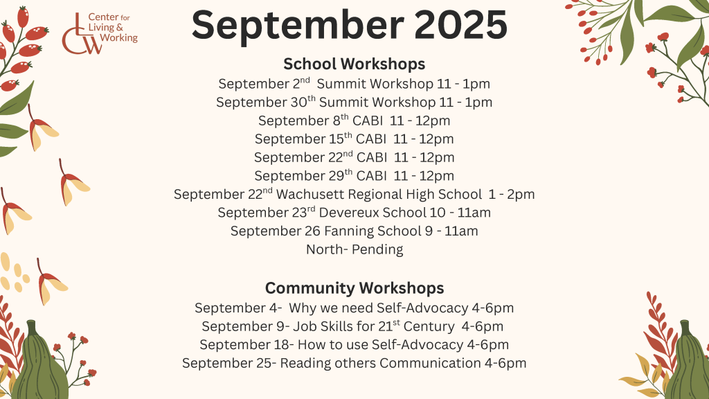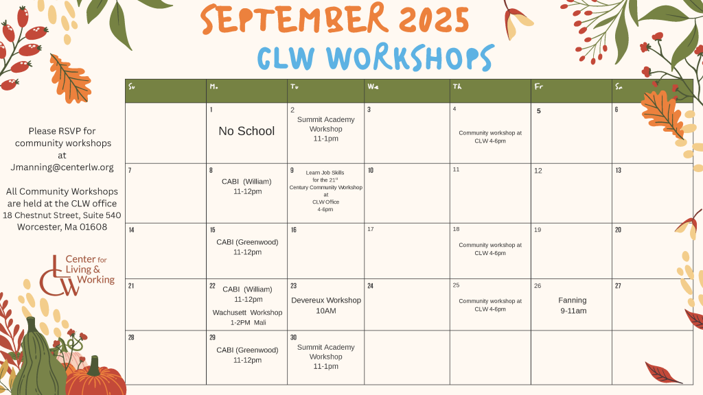 All Community Workshops are held at the CLW office 18 Chestnut Street, Suite 540 Worcester, Ma 01608