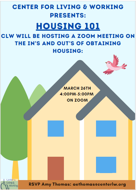 CENTER FOR LIVING & WORKING PRESENTS: HOUSING 101   CLW WILL BE HOSTING A ZOOM MEETING ON THE IN’S AND OUT’S OF OBTAINING HOUSING: WHEN: MARCH 26TH TIME: 4:00PM-5:00PM WHERE:...