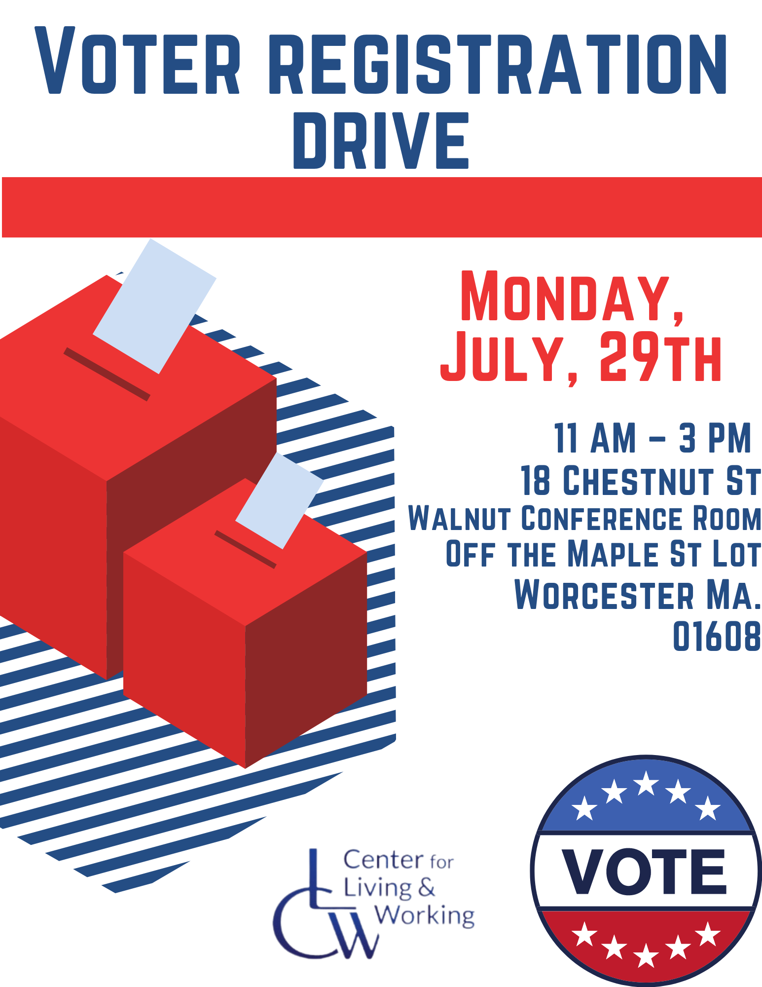 Join us for a Voter's Registration Drive on July 29th from 11am-3pm! 18 Chestnut St (Walnut Room) Worcester, MA 01608
